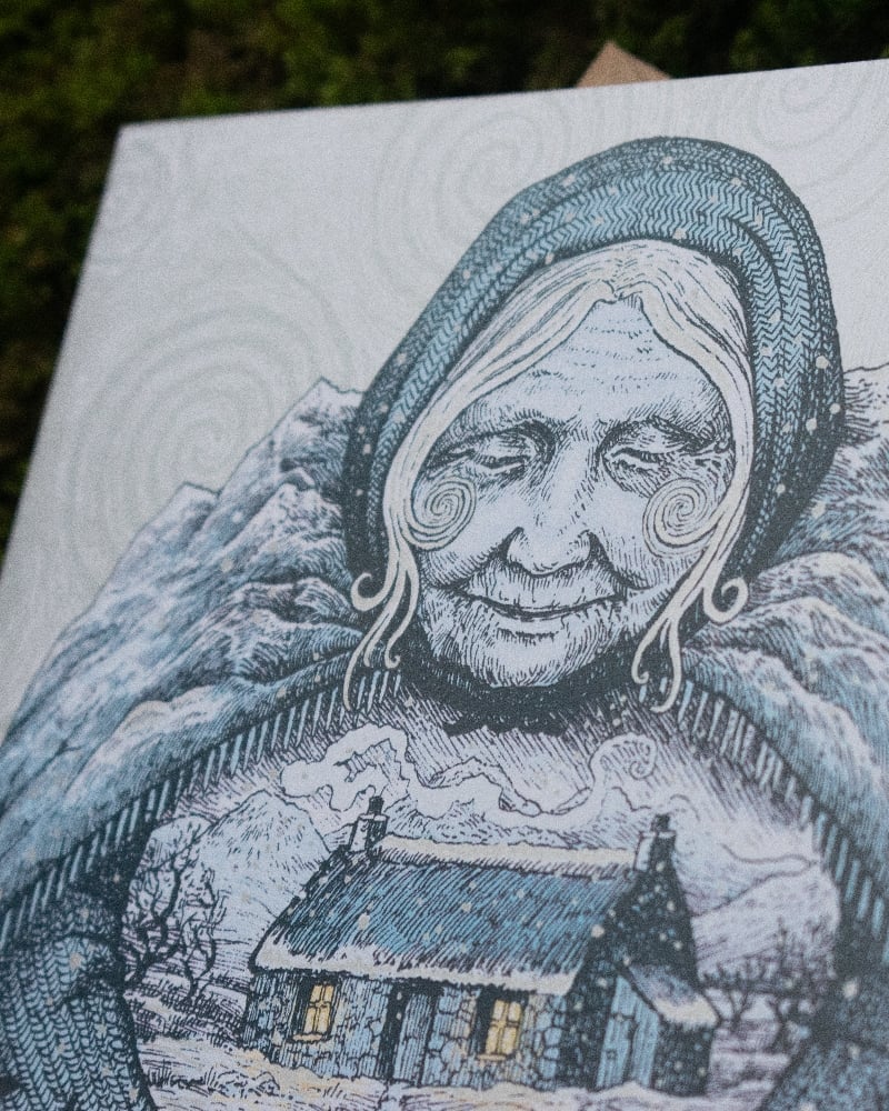 148mm square greetings card printed on thick card with metallic silver ink highlights and spirals that shine when moved in the light.