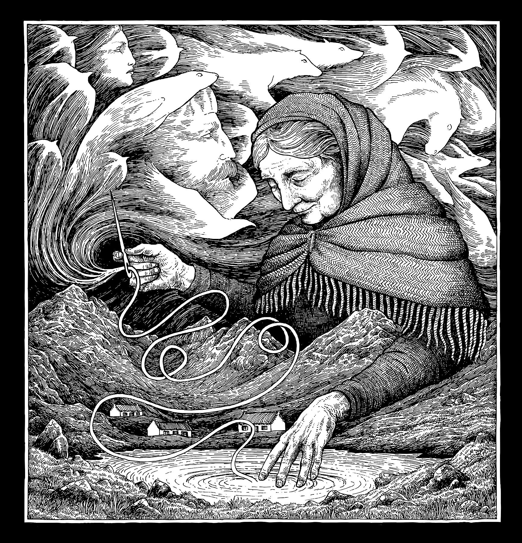 Fine art Giclée print of 'Weaving Stories Into The Land' ink drawing, printed using archival quality inks on Hahnemühle German Etching a 310gsm mould-made paper.
